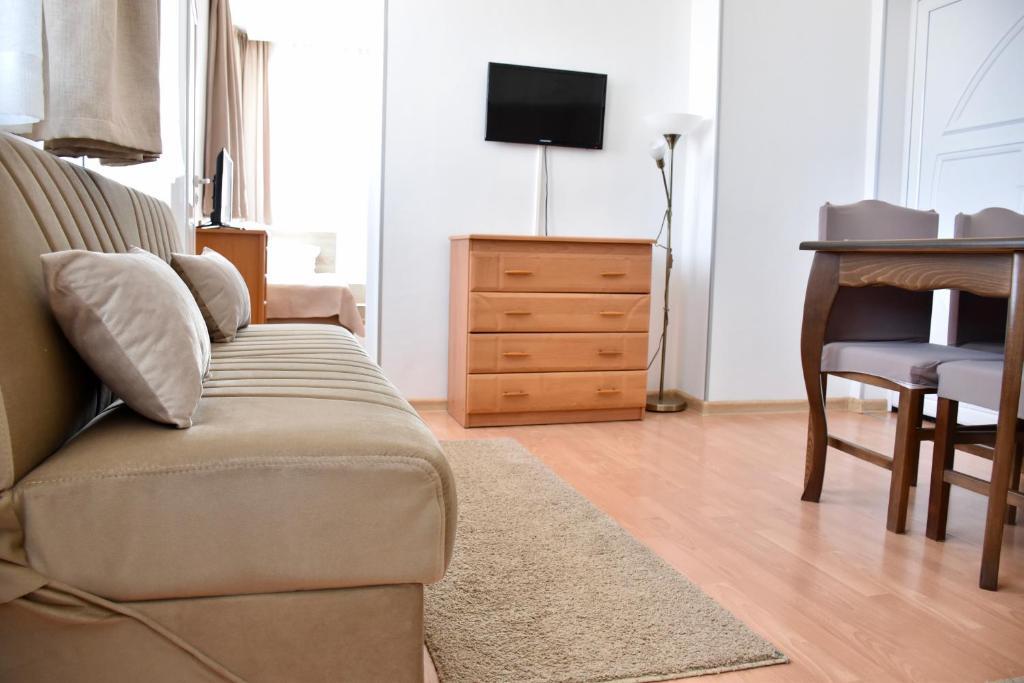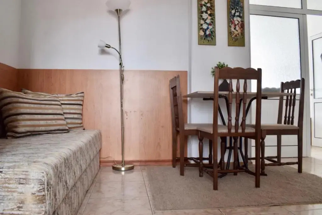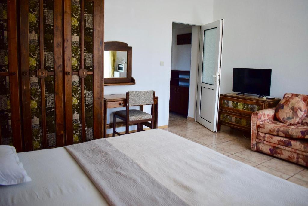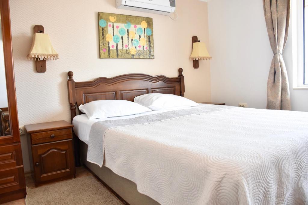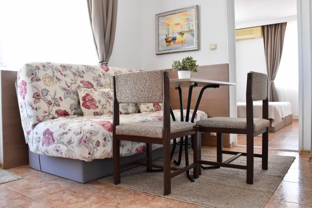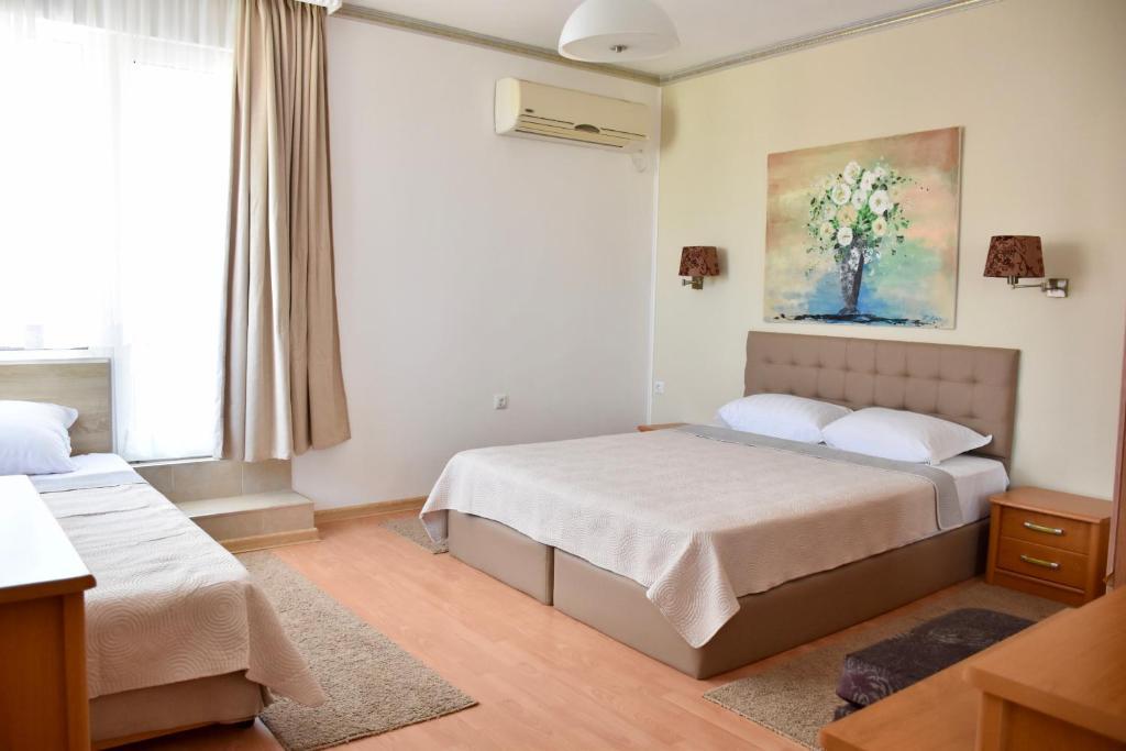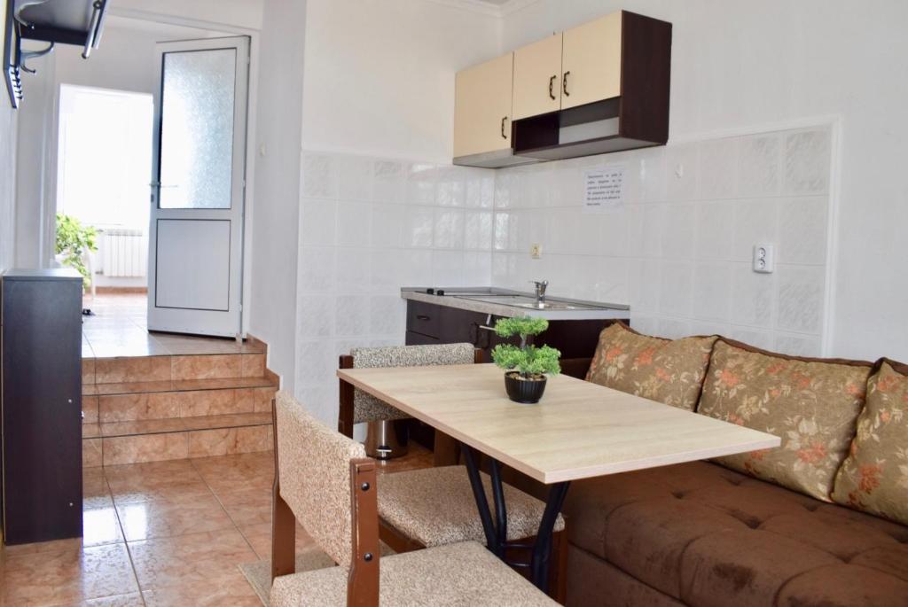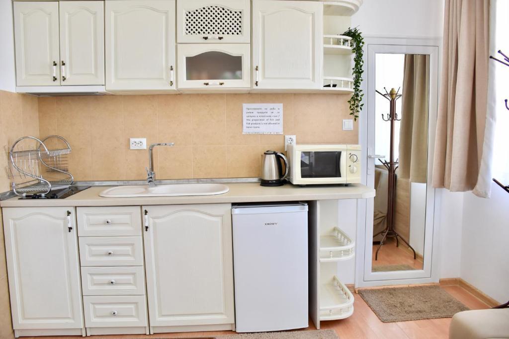 Отдыхали с семьей в июле 2019. Наше пребывание в этом мини отеле длилось 2 недели потому, он для нас стал родным домом, но я попытаюсь быть объективной. Мы очень волновались, что для семьи из 5ти челевек свадебные аппартаменты (именно их нам посоветовала хозяйка по телефону) будут тесноваты. Но все было очень просторно. Вид - невероятный! 2 балкона. На кухне есть все мелочи, а если чего-то нет, вам все принесут. Подушек целый арсенал - от почти плоской, до такой, что почти стоя спишь )). Постели чистые, полотенец хватало. Мебель нормальная. Тяжело выдвигались ящики, но жить можно. Матрасы очень мягкие, черезчур. У мужа болела спина. У кого проблемы с этим - учитывайте. Я бы настоятельно рекомендовала хозяевам поменять электрочайник, потому что нам 2 недели пить чай со вкусом дёшевого пластика было весьма неприкольно. Ну и то, что лично меня крайне напрягало. 1. Несливаемая вода в туалетной комнате, она же ванная, она же душевая. Значит в полу слив. Возле него - унитаз, умывальник и эта вода после душа стоит по щиколотку, пока уборщица не придет на уборку. Это настоящий треш! 2е детей, которые перед походом в туалет обувались. Если они забывали разбуваться, то сразу же падали на плитке, потому что обувь была мокрая. Старшый так упал однажды!!! Там межкомнатные двери - пластиковые, с порожками. Так малой о такой порог колено разбил, что аж хрящ оголился. Короче, надо срочно что-то с этим предпринимать - с несливаемой водой и скользкой плиткой. Постелите везде ковролин. Потому что с ванной там вариантов 0, не переделаешь или будет очень дорого. 2. Уборщицы. Ну... как бы да... В Болгарии я 10й раз!! Всегда отдыхаем в гостинницах, ни разу не снимали квартиру. Это впервые мне попались такие нестандартные для Болгарии ) горничные. Во-первых, их всегда тянуло убирать, там, где не надо - поперекладывать продукты, протереть стол, хоть с этим у нас было идеально. Но помыть пол или вымокать ту же воду в этой ужасной ванной комнате - это надо было просить. Ну и они после просьб обижались, входили без стука или хлопали дверью. Это нормально? Спасибо хозяйке, что помогла с выбором комнаты. Но, когда мы приехали, мне всегда казалось, что мы ее напрягаем. Она всегда была типа на нервах или уставшая, не знаю. Не чувствовала я ни радушия, ни приветливости. Хозяин более располагающий, но тоже больше ла-ла на словах. Паркоместо у нас было. И оно было рядом. Подыдожу. Отдых впринципе мне понравился. Есть ньюансы. Но больше плюсов. Если владельцы прислушаются и решат вопрос с чайником, проведут пару тренингов своему персоналу ну и с ванной придумают что-то, то смело буду рекомендовать ). А пока - решать вам.