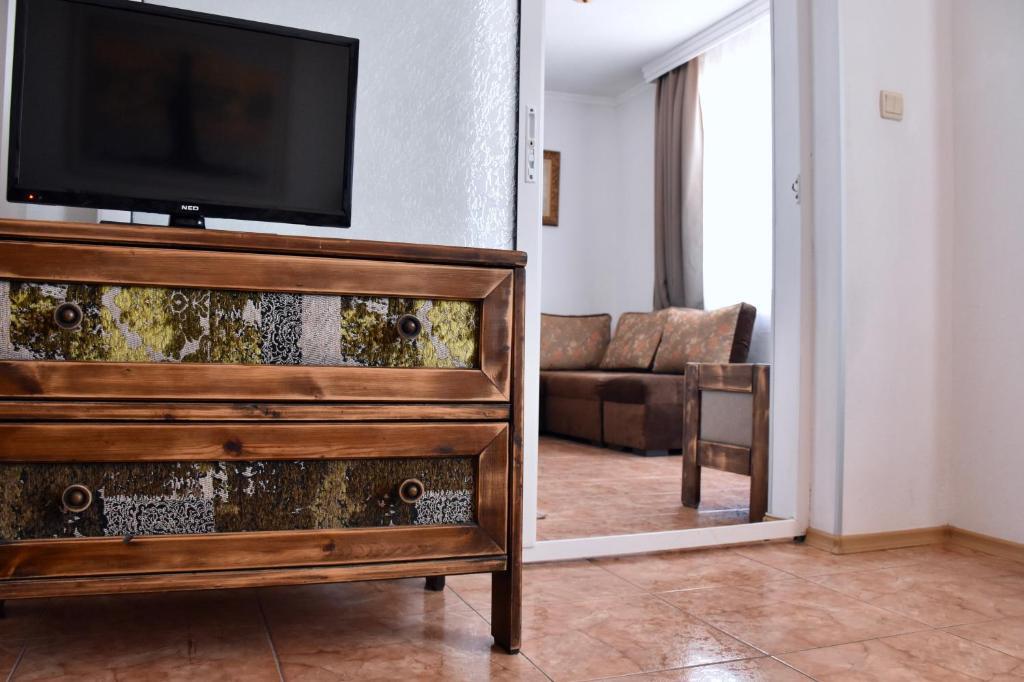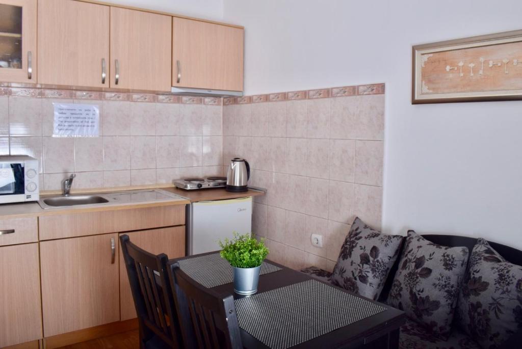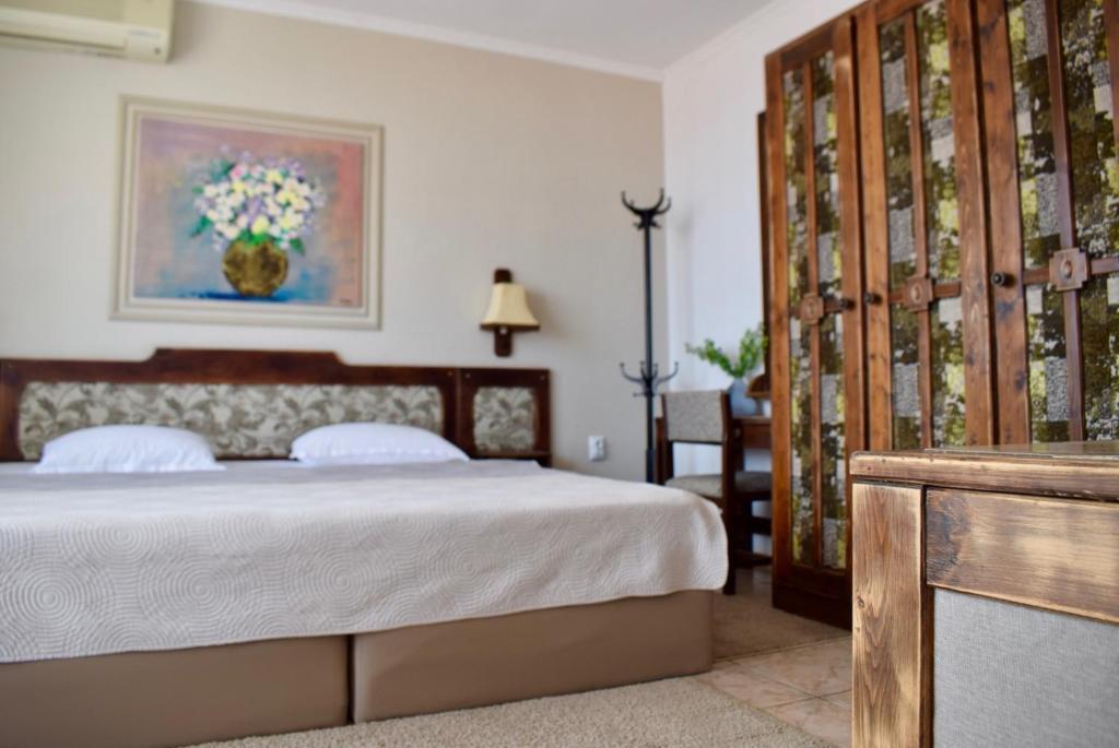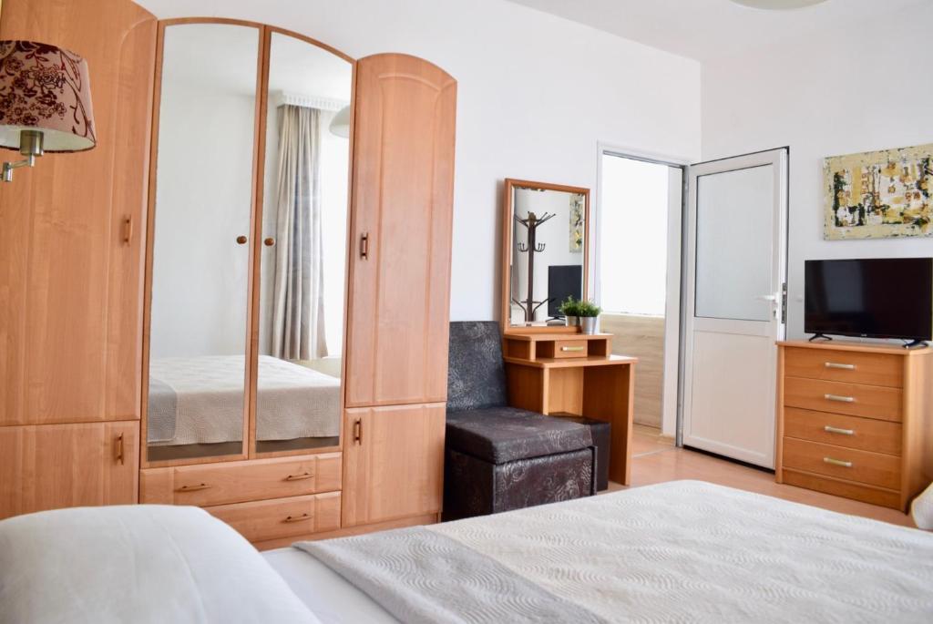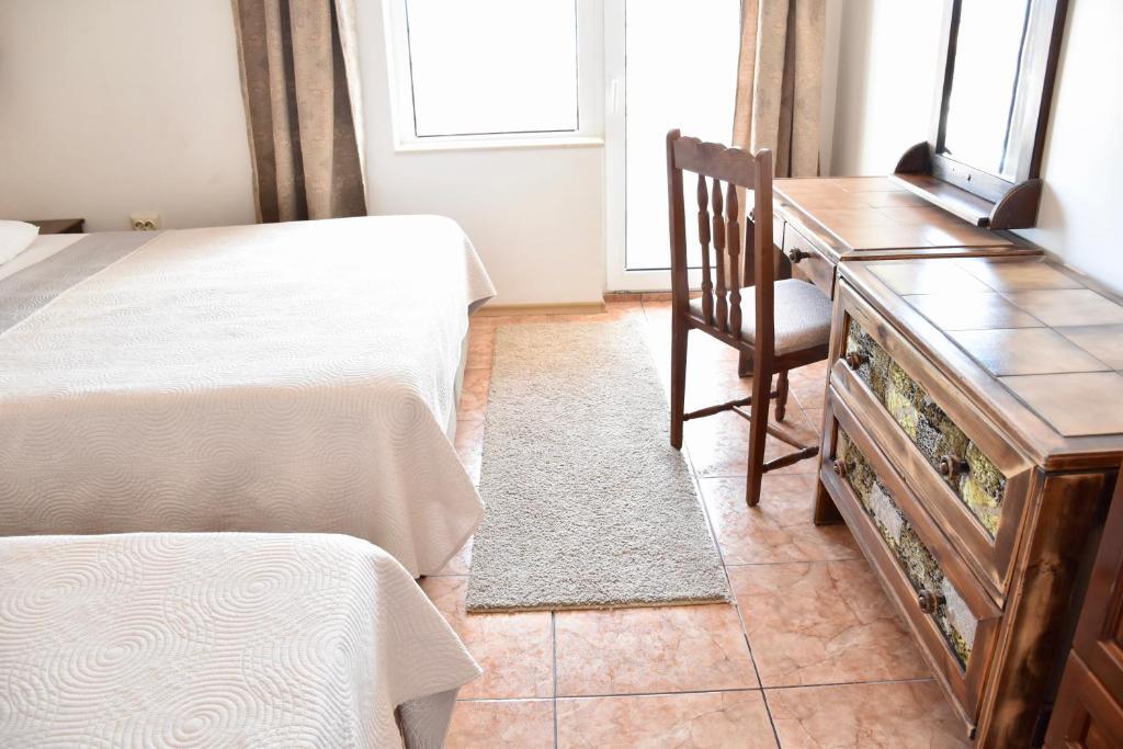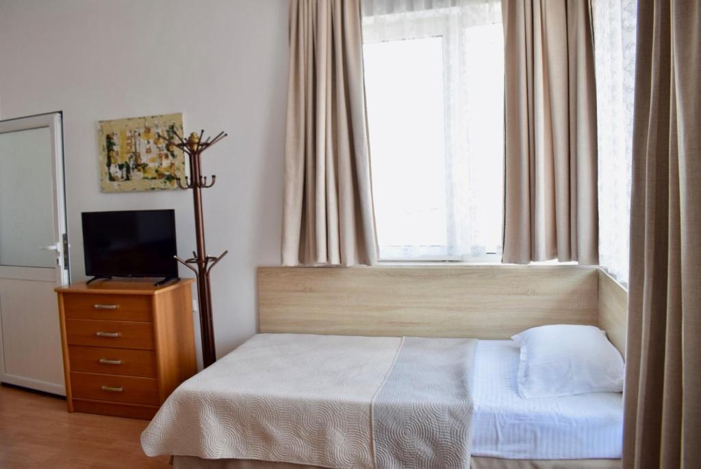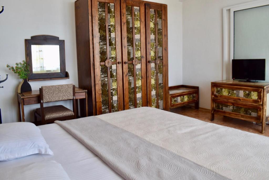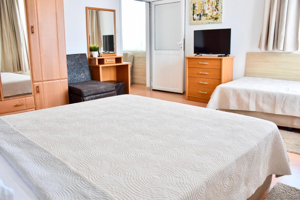 Отдыхали с семьей в июле 2019. Наше пребывание в этом мини отеле длилось 2 недели потому, он для нас стал родным домом, но я попытаюсь быть объективной. Мы очень волновались, что для семьи из 5ти челевек свадебные аппартаменты (именно их нам посоветовала хозяйка по телефону) будут тесноваты. Но все было очень просторно. Вид - невероятный! 2 балкона. На кухне есть все мелочи, а если чего-то нет, вам все принесут. Подушек целый арсенал - от почти плоской, до такой, что почти стоя спишь )). Постели чистые, полотенец хватало. Мебель нормальная. Тяжело выдвигались ящики, но жить можно. Матрасы очень мягкие, черезчур. У мужа болела спина. У кого проблемы с этим - учитывайте. Я бы настоятельно рекомендовала хозяевам поменять электрочайник, потому что нам 2 недели пить чай со вкусом дёшевого пластика было весьма неприкольно. Ну и то, что лично меня крайне напрягало. 1. Несливаемая вода в туалетной комнате, она же ванная, она же душевая. Значит в полу слив. Возле него - унитаз, умывальник и эта вода после душа стоит по щиколотку, пока уборщица не придет на уборку. Это настоящий треш! 2е детей, которые перед походом в туалет обувались. Если они забывали разбуваться, то сразу же падали на плитке, потому что обувь была мокрая. Старшый так упал однажды!!! Там межкомнатные двери - пластиковые, с порожками. Так малой о такой порог колено разбил, что аж хрящ оголился. Короче, надо срочно что-то с этим предпринимать - с несливаемой водой и скользкой плиткой. Постелите везде ковролин. Потому что с ванной там вариантов 0, не переделаешь или будет очень дорого. 2. Уборщицы. Ну... как бы да... В Болгарии я 10й раз!! Всегда отдыхаем в гостинницах, ни разу не снимали квартиру. Это впервые мне попались такие нестандартные для Болгарии ) горничные. Во-первых, их всегда тянуло убирать, там, где не надо - поперекладывать продукты, протереть стол, хоть с этим у нас было идеально. Но помыть пол или вымокать ту же воду в этой ужасной ванной комнате - это надо было просить. Ну и они после просьб обижались, входили без стука или хлопали дверью. Это нормально? Спасибо хозяйке, что помогла с выбором комнаты. Но, когда мы приехали, мне всегда казалось, что мы ее напрягаем. Она всегда была типа на нервах или уставшая, не знаю. Не чувствовала я ни радушия, ни приветливости. Хозяин более располагающий, но тоже больше ла-ла на словах. Паркоместо у нас было. И оно было рядом. Подыдожу. Отдых впринципе мне понравился. Есть ньюансы. Но больше плюсов. Если владельцы прислушаются и решат вопрос с чайником, проведут пару тренингов своему персоналу ну и с ванной придумают что-то, то смело буду рекомендовать ). А пока - решать вам.