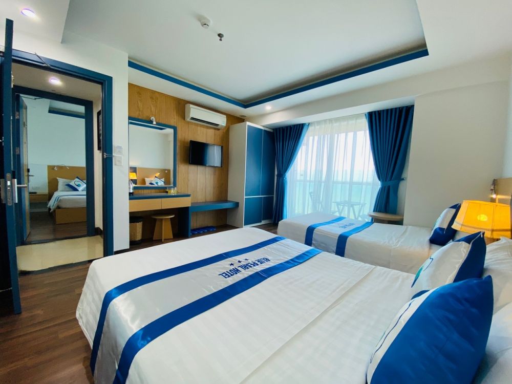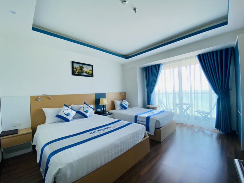В комфортабельном номере делюкс гости размещаются на двуспальной и односпальной кроватях. В Удобства включают мини-бар, телефон, сейф, беспроводной интернет, телевизор, чайно-кофейные принадлежности, кондиционер. Ванная комната оборудована душем, есть фен, тапочки, туалетные принадлежности. С балкона номера открывается вид на море.